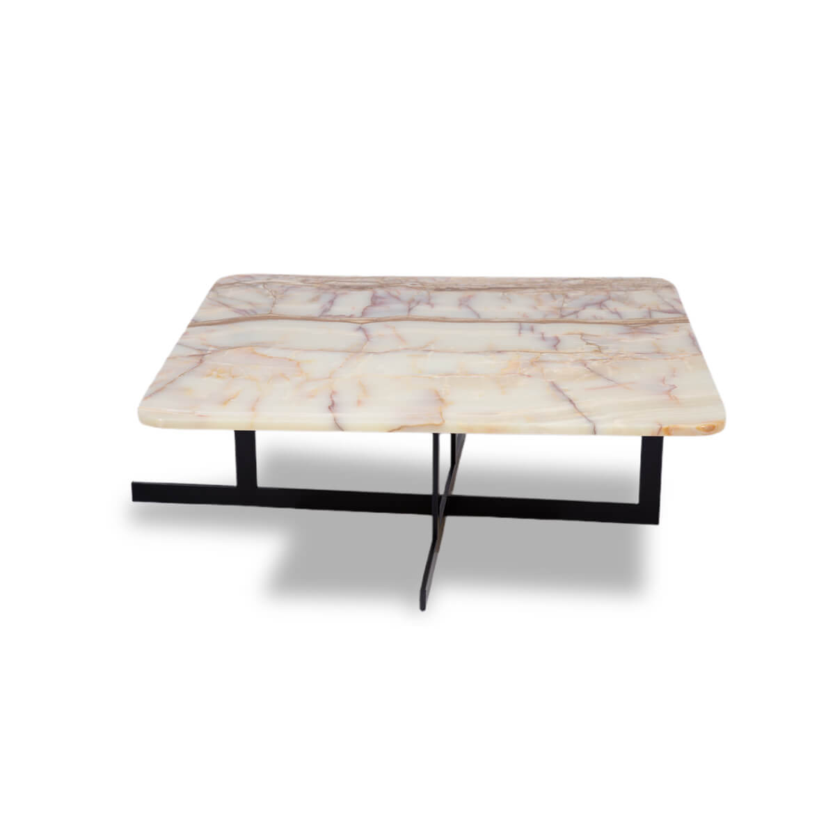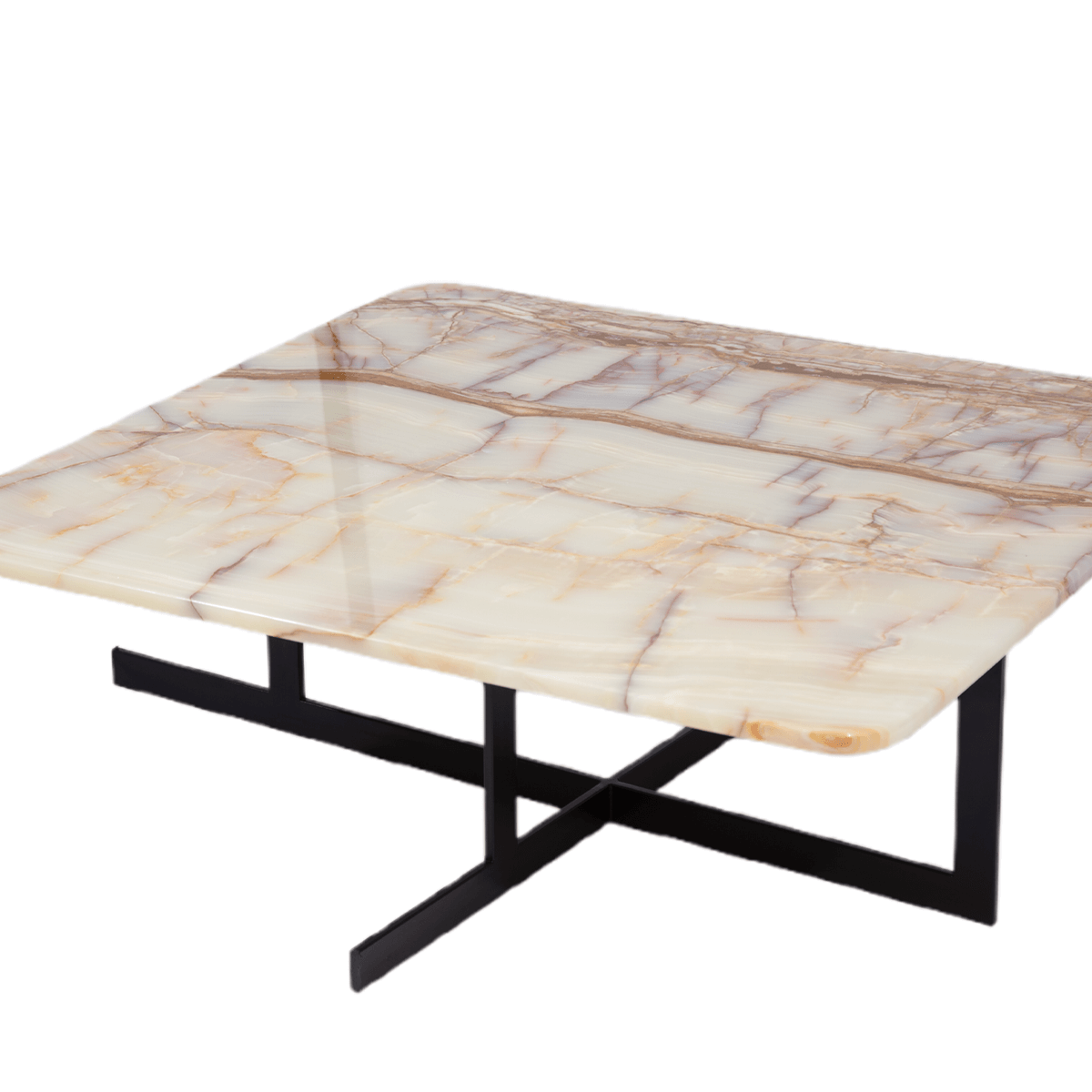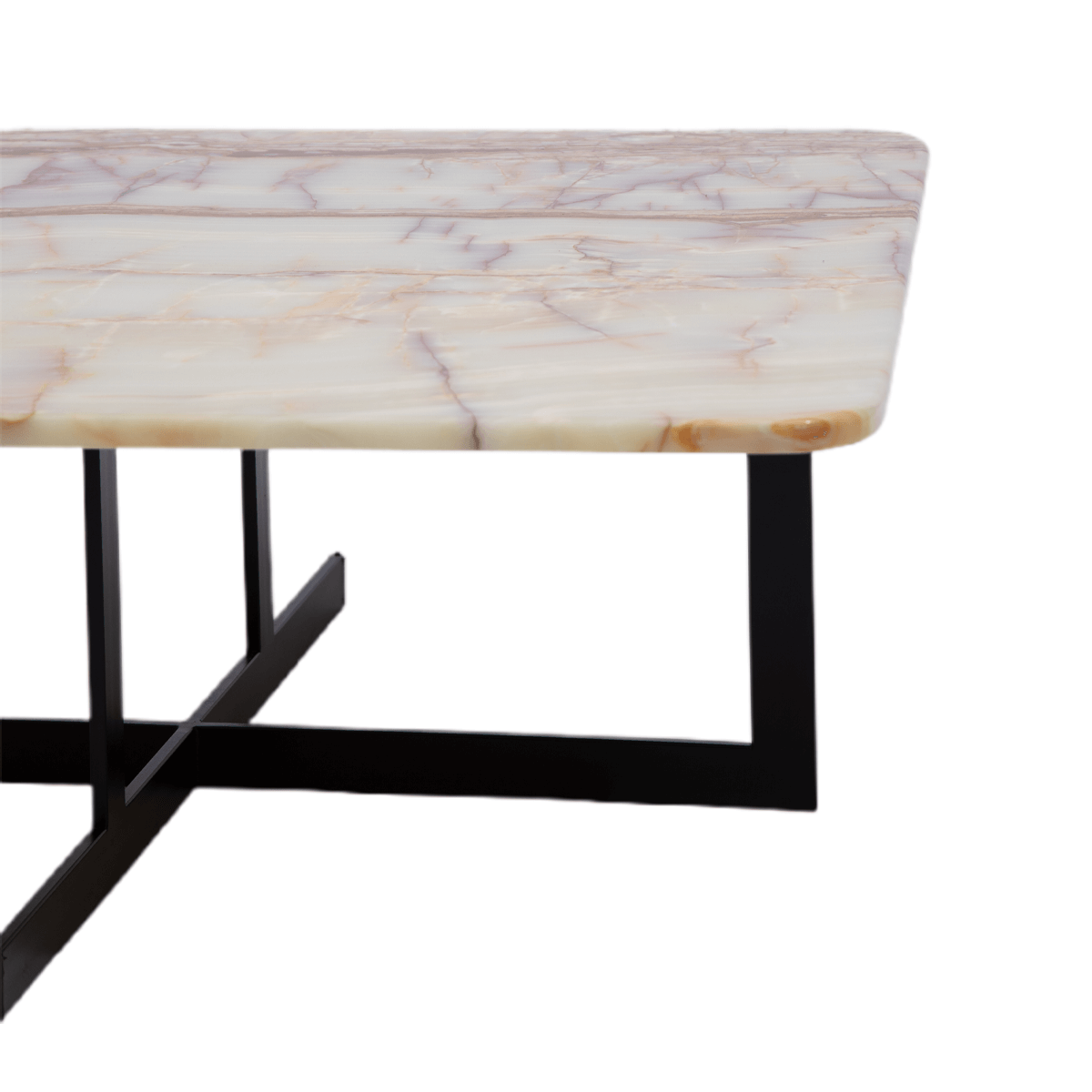 La table basse RIVIERA se distingue comme une pièce de caractère au design résolument architectural. Son socle en X, disponible en fer brut ou en inox poli, joue la carte de la robustesse graphique. Les extrémités volontairement débordantes de la structure créent un effet sculptural unique, tout en affirmant la personnalité contemporaine de cette pièce Son plateau en onyx, pierre précieuse aux veines naturelles et aux reflets lumineux, apporte une dimension luxueuse et organique à l’ensemble.